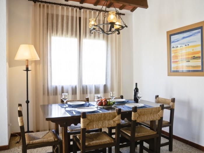 Complex formed by semi-detached houses type duplex. On the first floor living room with balcony, TV, separate kitchen with ceramic hob, microwave and washing machine, bathroom with shower and a double bedroom. On the ground floor two double bedrooms plus a bedroom with bunk beds or two double bedrooms with double sofa bed in the dining room, bathroom with bathtub, garage and small garden.